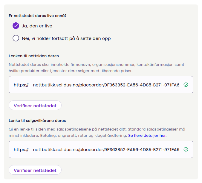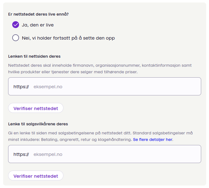 Du kan legge inn lenken til nettbutikken på nytt som salgsvilkår dersom dere ikke har deres egne salgsvilkår og bare skal ha donasjoner eller enkelt medlemskap. Skal dere selge varer eller billetter krever Vipps mer utfyllende salgsvilkår.