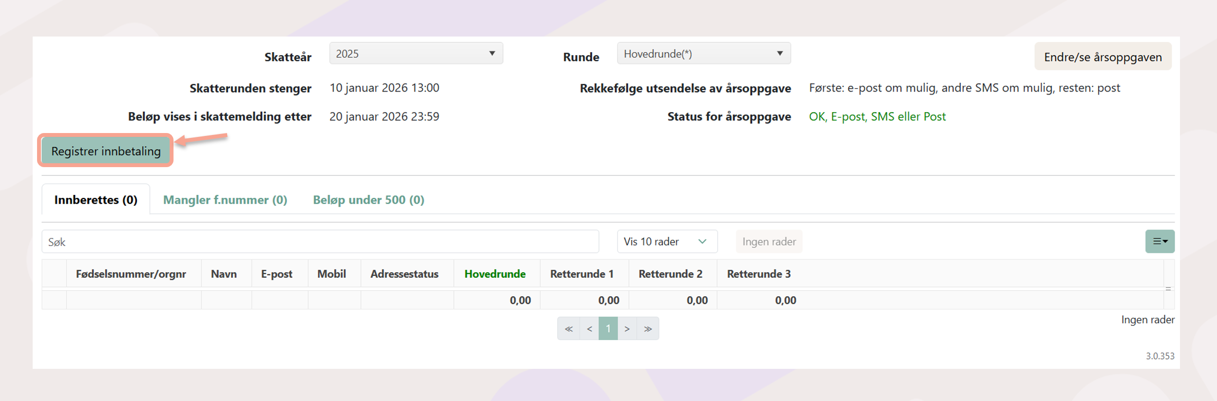 For å rette opp i beløp som er registrert, enten justere opp eller ned, må du registrere et nytt beløp på kontakten. Dette kan du gjøre ved å trykke «Registrer innbetaling» og skrive inn fødselsnummer på nytt, eller ved å registrere ny innbetaling på kontakten direkte fra listen i Oversikt skatteinnberetning.
