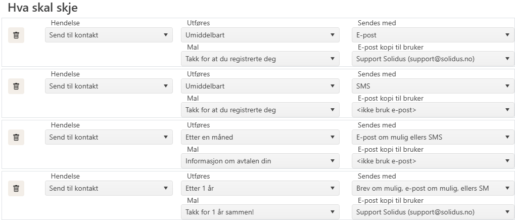 På denne måten kan du automatisere et lengre automatisert løp for nye givere og medlemmer. For eksempel kan dette være en SMS og en epost for å bekrefte oppstart, en epost med mer informasjon etter 1 måned og, et takkebrev etter 1 år. Eksempel: