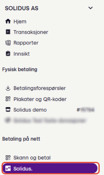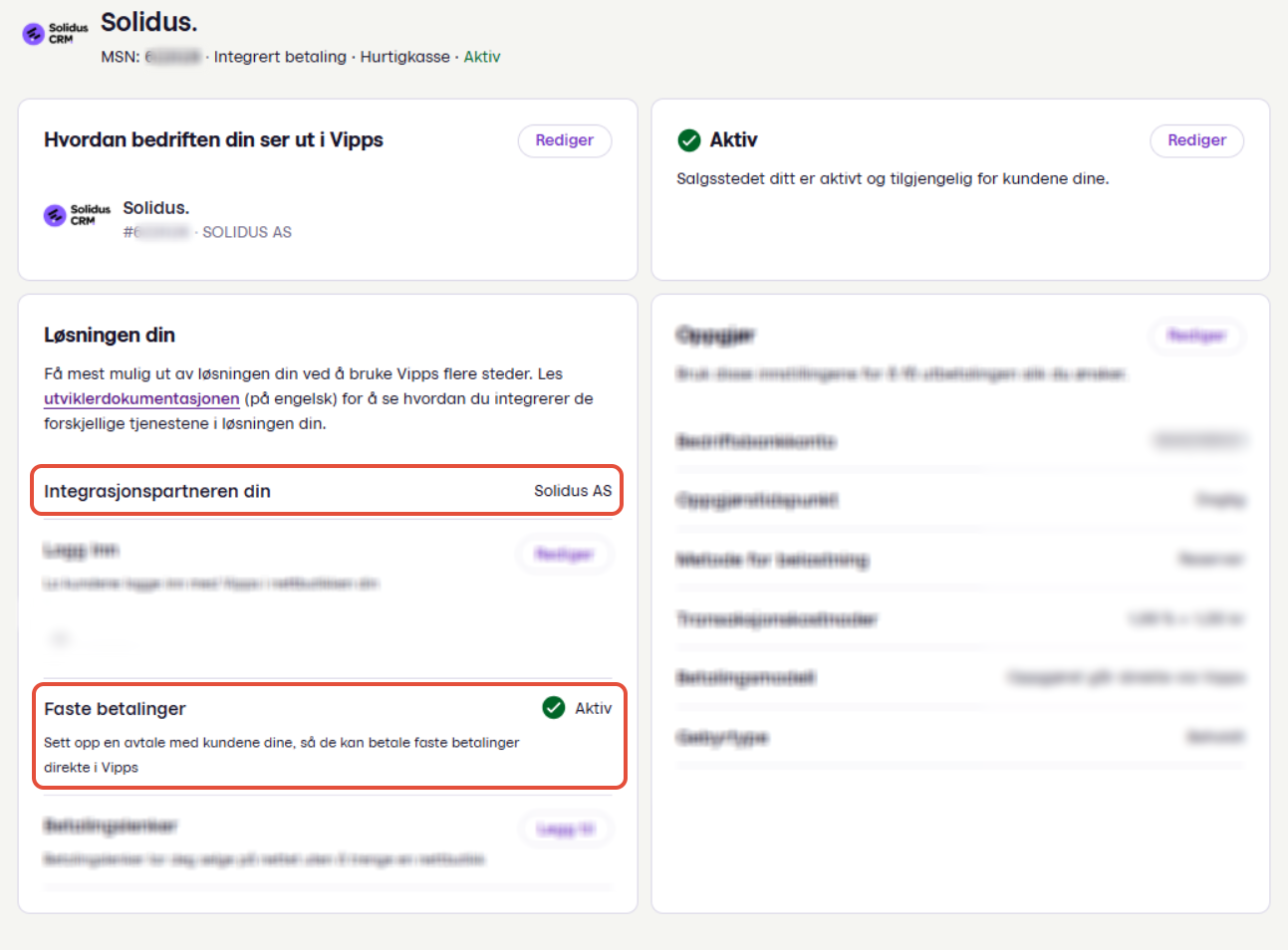 2. Under "Løsningen din" finner du Faste betalinger. Pass også på at integrasjonspartneren er Solidus AS.