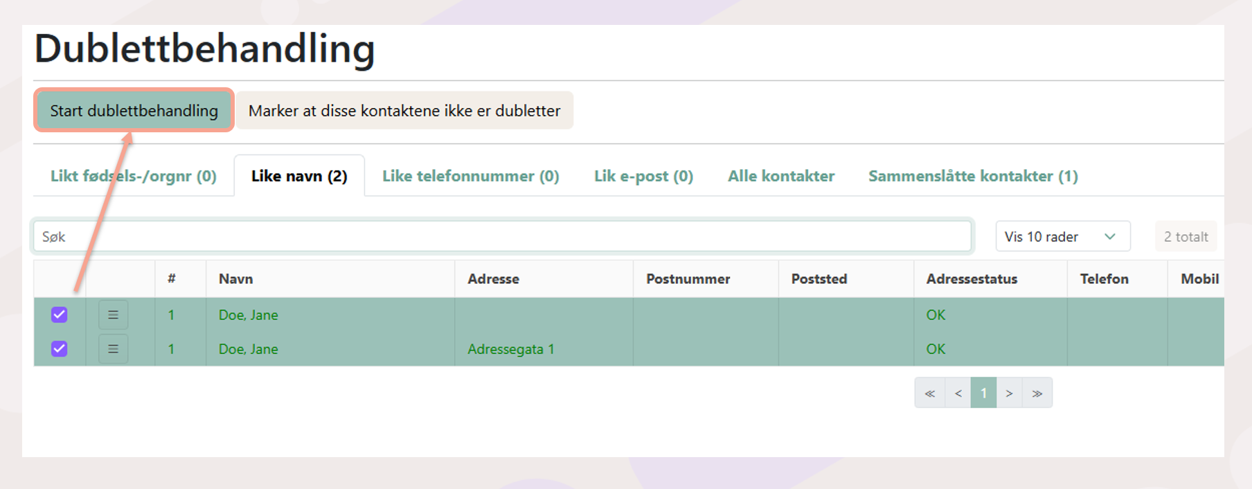 Huk av for de to kontaktene du vil dublettbehandle, og trykk "Start dublettbehandling"