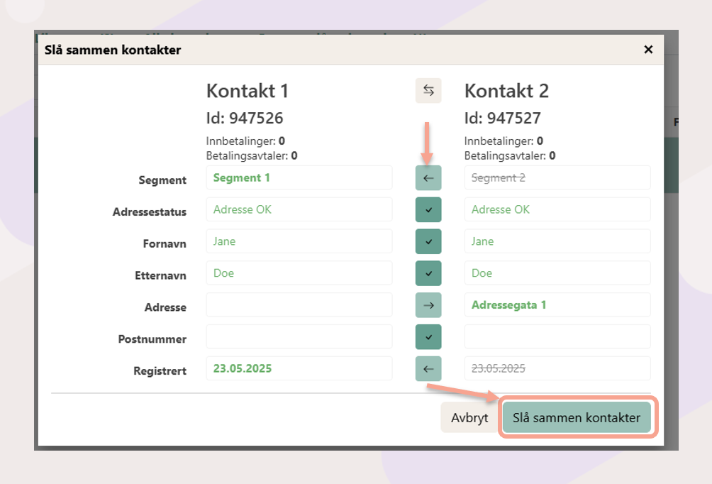 Gå gjennom de ulike feltene for hva som skal beholdes. Der det er en pil velger du fra hvilken side den nye kontakten skal beholde informasjonen. Informasjonen som blir beholdt er uthevet, og informasjonen som sletters står streket over. Til slutt velger du "Slå sammen kontakter" for å fullføre dublettbehandlingen.
