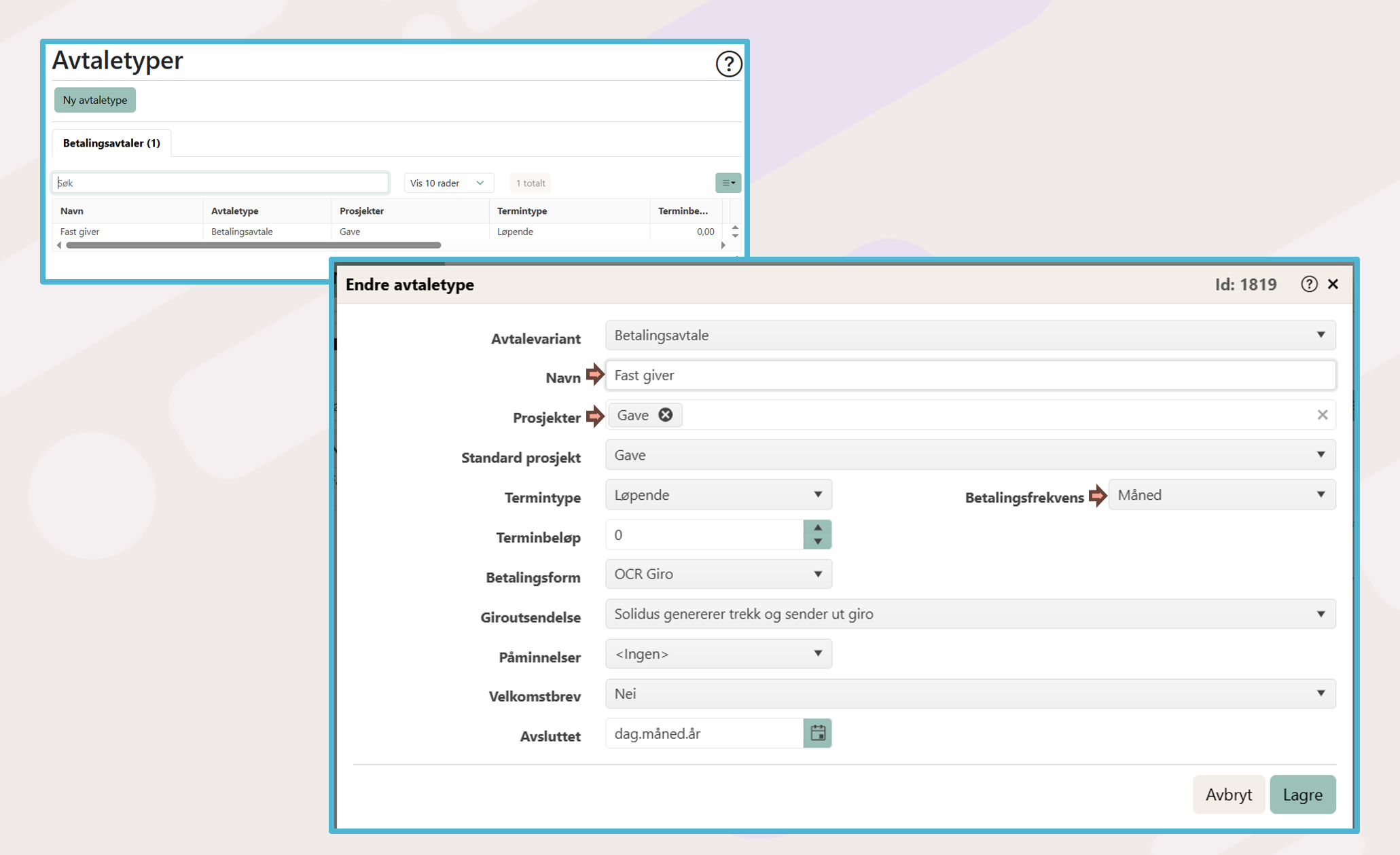 For abonnement, medlemskap og fadderskap anbefaler vi å opprette én avtaletype per medlemskapsprosjekt, med fastsatt terminbeløp på avtaletypen. Dette gir bedre kontroll og enklere oppfølging av avtalene.