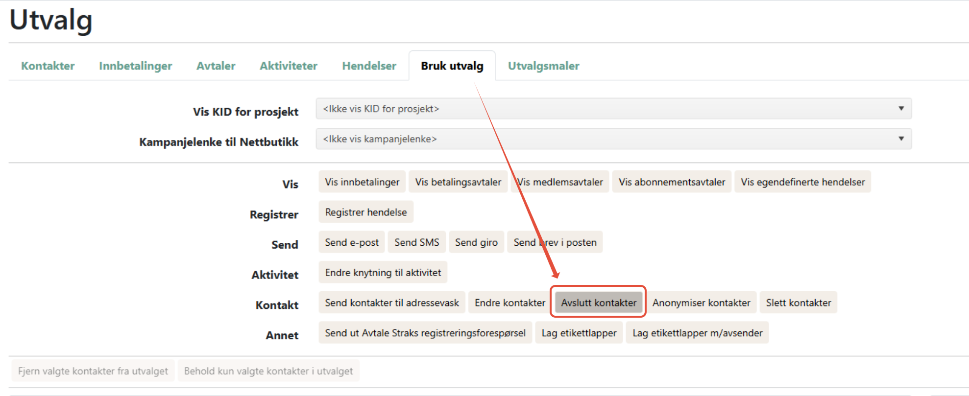 For å avslutte kontaktene i listen, gå til fanen Bruk utvalg og velg knappen "Avslutt kontakter". Bekreft igjen for å avslutte kontaktene.