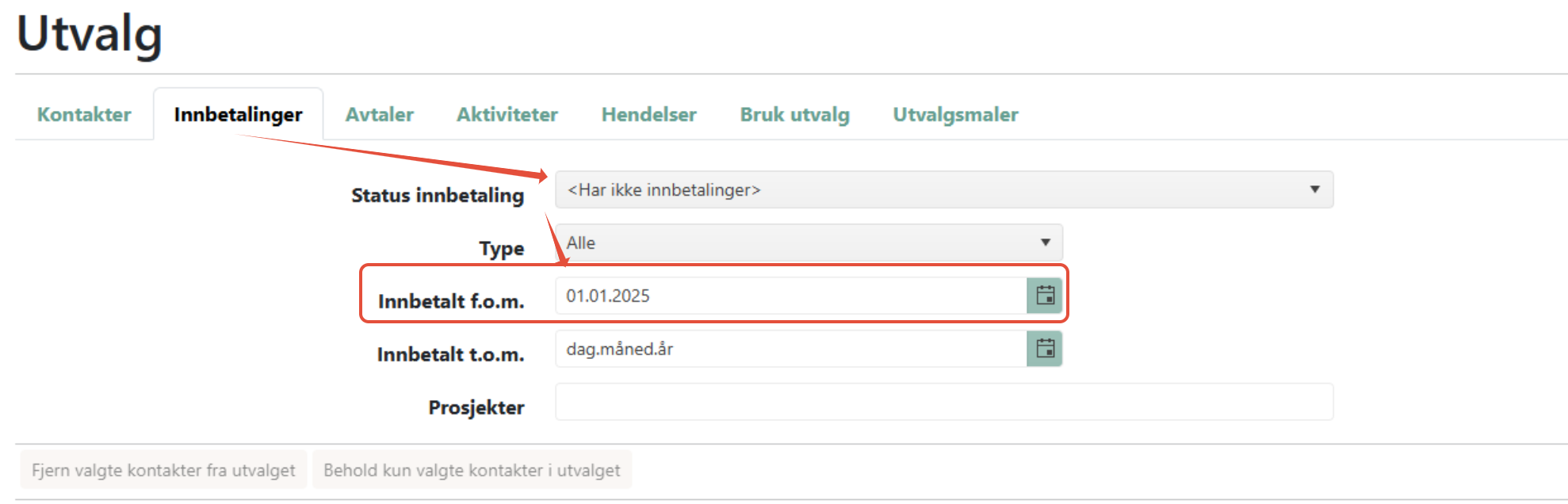 Velg innbetalt f.o.m. (fra og med) dato. Vi anbefaler at du går tilbake minst 1 skatteår, og at du venter til etter skatteinnberetningen med å avslutte kontakter.